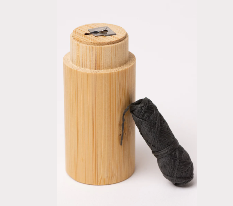 End of life: Throw out floss - as it contains polyester. Bamboo case can be composted after removing the recyclable metal blade.