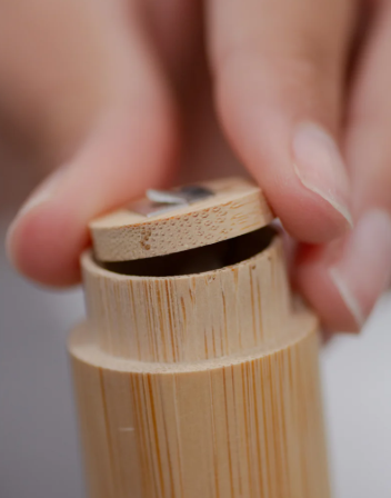 Bamboo Case: Bamboo case should be reused for refills. Comes with one full size floss spool inside.