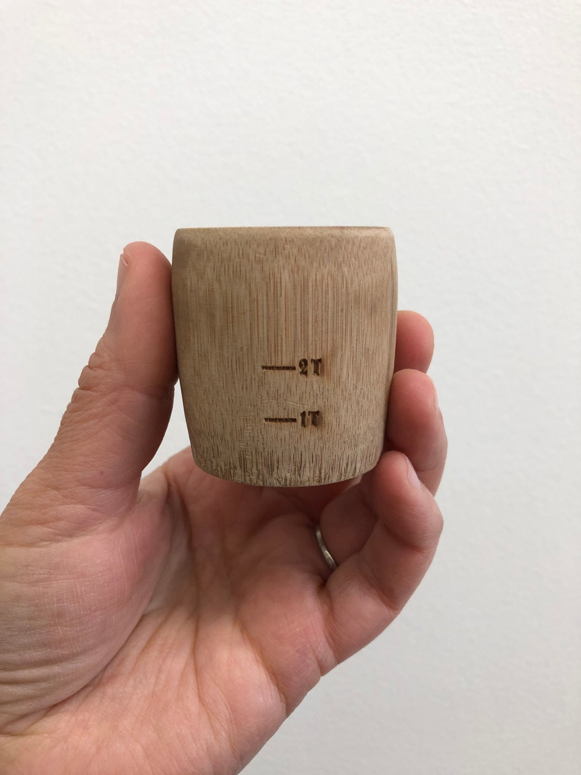 About the size of a traditional shot glass, with indicators at 1 Tablespoon and 2 Tablespoons.