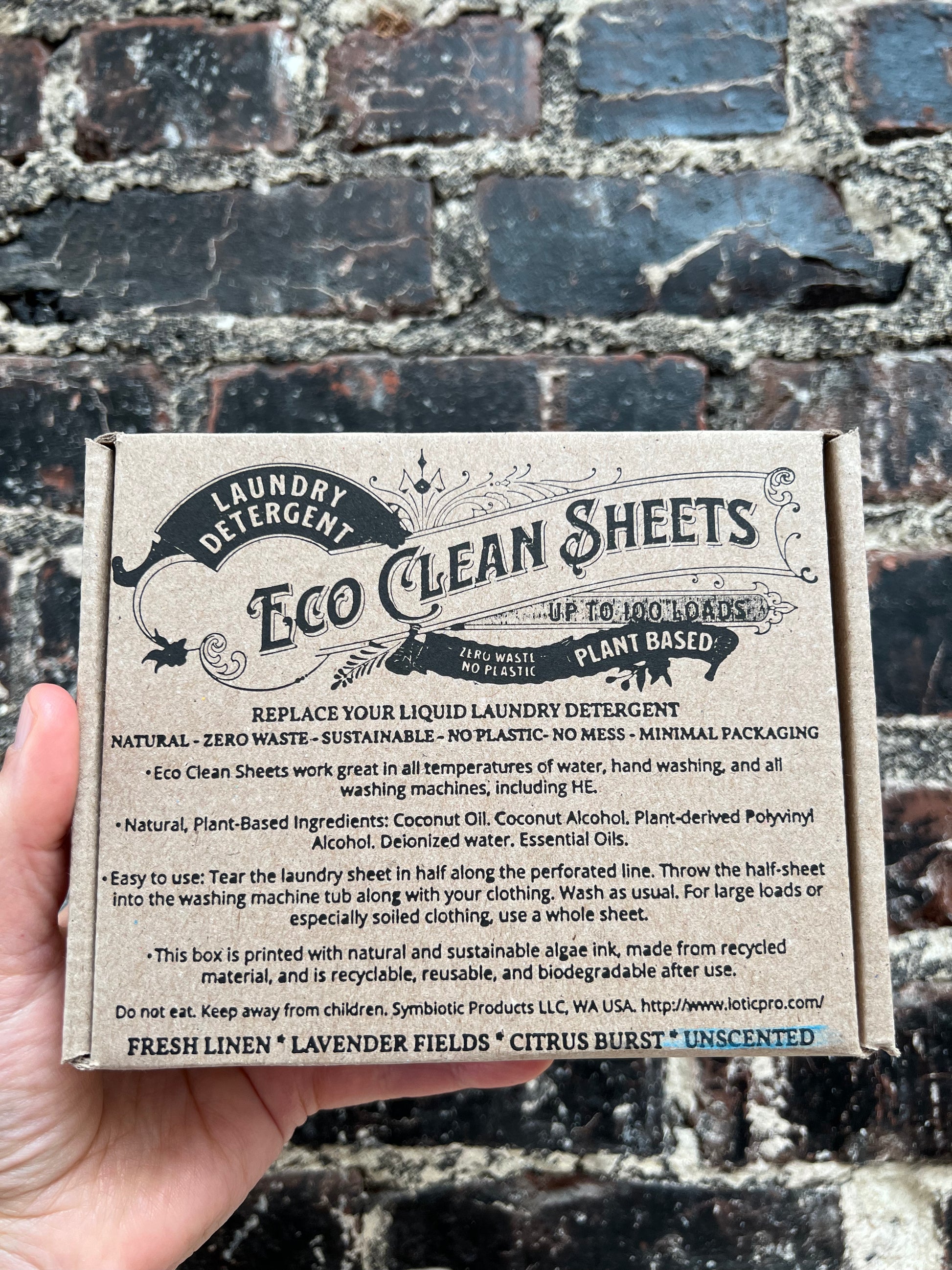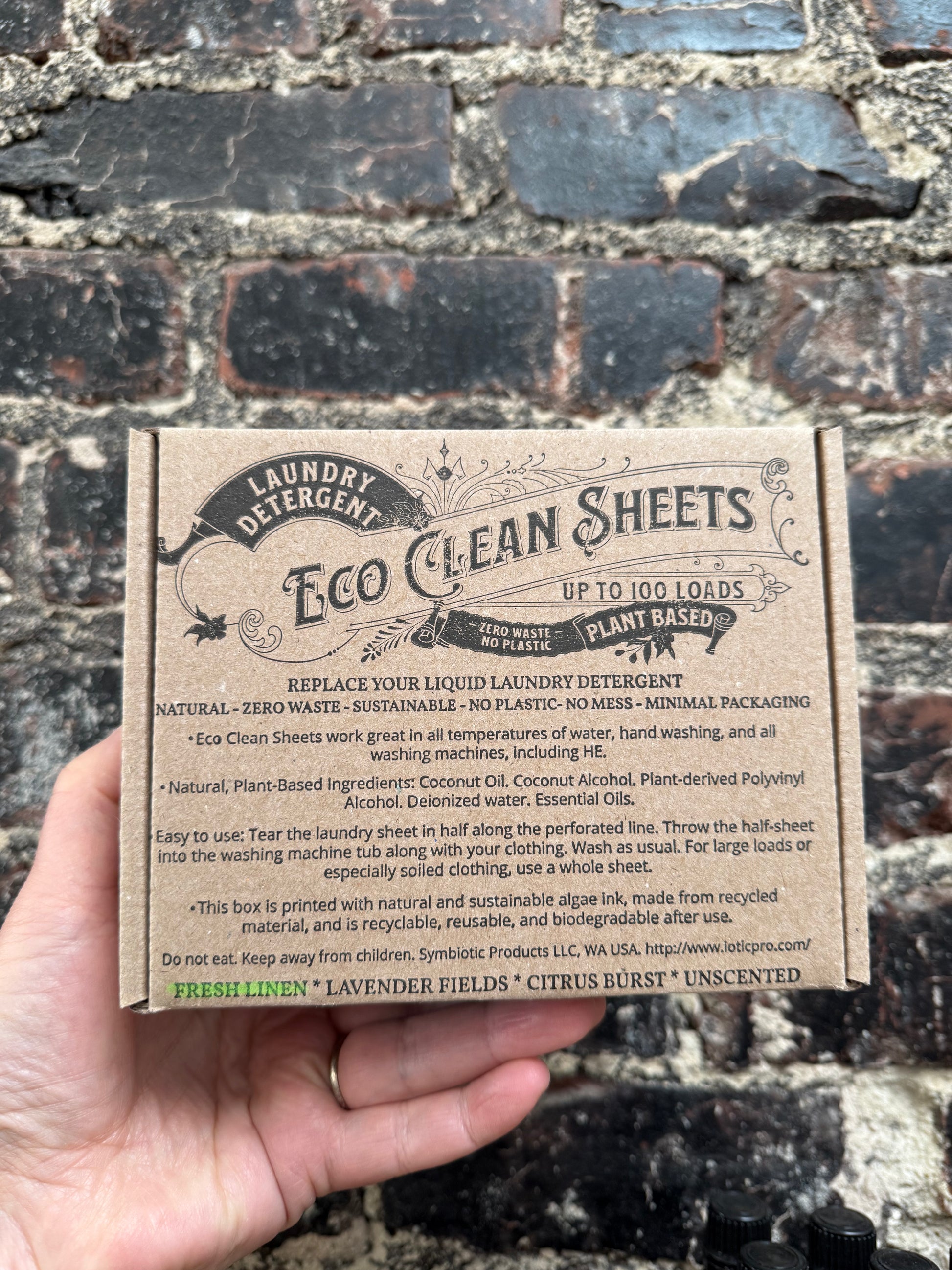 Eco Clean Laundry Sheets - Natural, Plant-Based Ingredients: Decyl glucoside (surfactant derived from Coconut) Polyvinyl Alc. (biodegradable supporting matrix) Glycerin (textural additive) Deionized water (solvent) Essential oil (natural fragrance) Coconut oil (surfactant)
