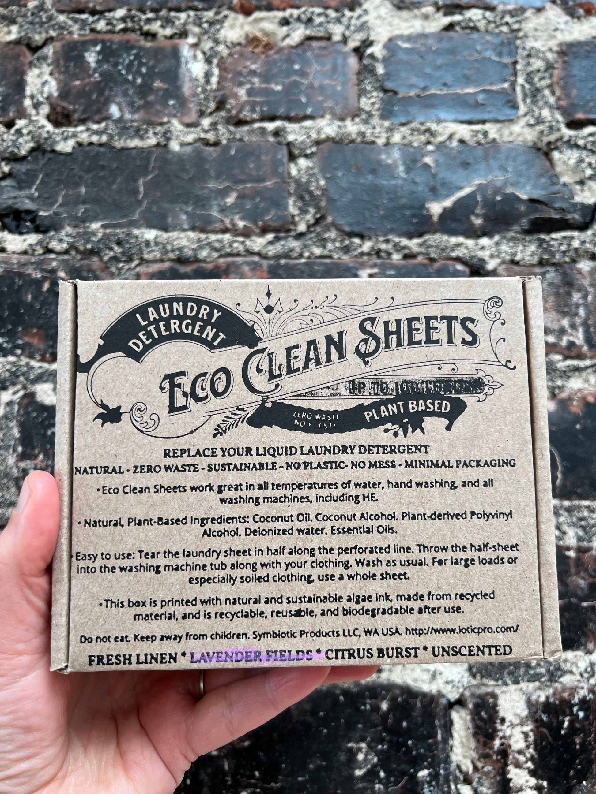 Eco Clean laundry sheets are minimally packaged in recycled cardboard boxes...NOW PRINTED WITH SUSTAINABLE ALGAE INK. No Petroleum-based inks! No Plastics!