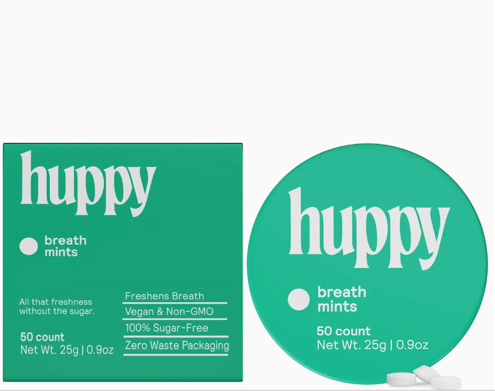 Huppy Breath Mints are a clean, sugar-free way to freshen breath on the go — with a naturally cool flavor from organic peppermint and spearmint oils. Each mint delivers a balanced burst of freshness without artificial sweeteners or plastic packaging. Made with just a handful of clean ingredients — including xylitol, coconut oil, and essential oils — these mints help reduce dry mouth, support oral health, and may help prevent cavities by neutralizing acids and limiting bacteria. Each compact tin includes 50 mints and is great for everyday use, travel kits, or gift boxes. The tin is sleek, portable, and designed for reuse or recycling. Details: – 50 Mints per Tin – Fresh Mint Blend (Peppermint + Spearmint Oils) – Sugar-Free (with Xylitol) – Freshens Breath & Supports Oral Health – Minimal, Clean Ingredients – Travel-Friendly Format – Plastic-Free Packaging
