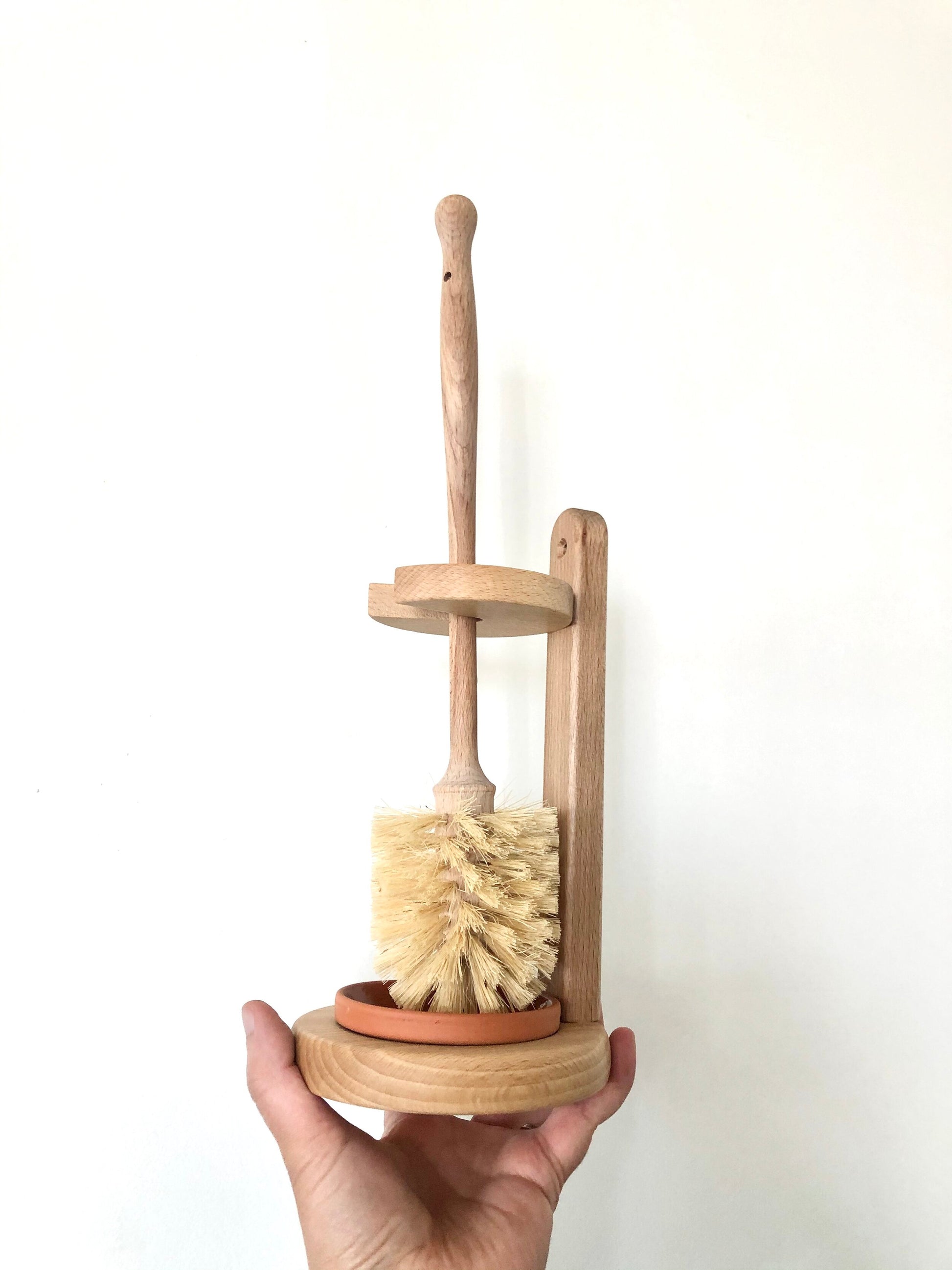 Natural tampico fiber toilet brush with all wood handle. Terra cotta drip tray with wood stand.